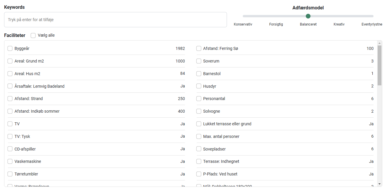 Til generering af tekster bruger vi keywords, husfaciliteter og adfærdsmodel.